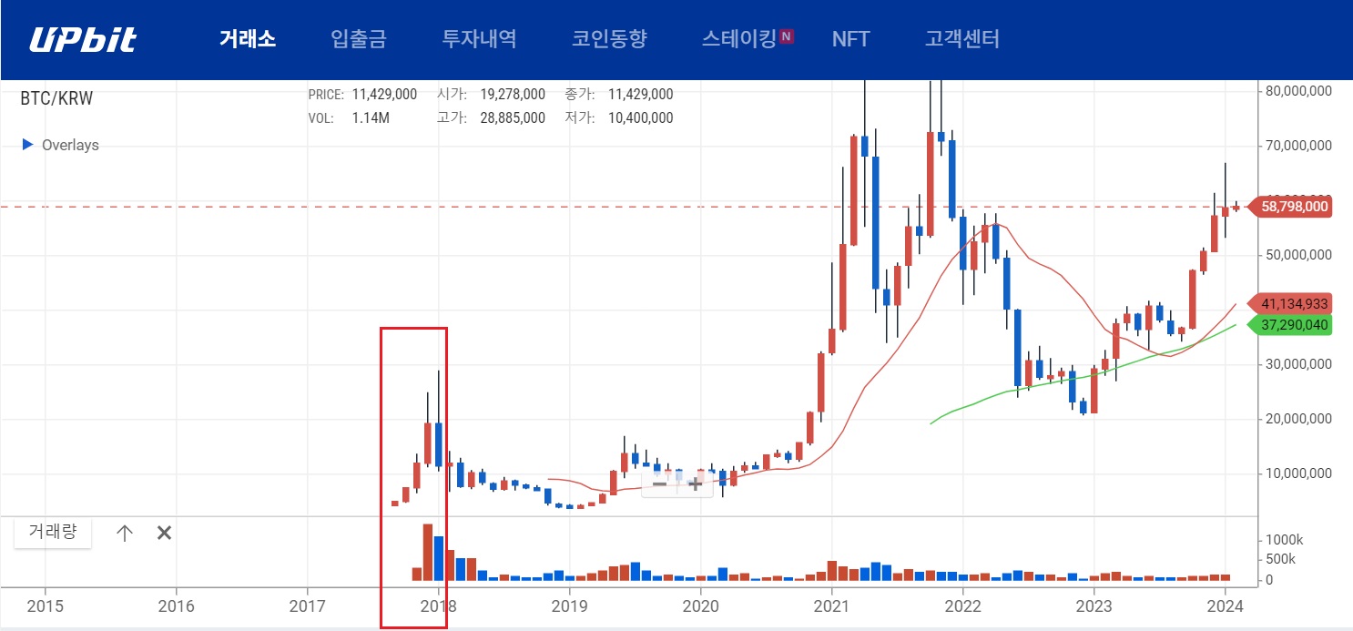 위 차트의 기둥 하나는 '월'입니다. 2017년은 코인이 폭등하던 시기였으나, 2018년 1월에 폭락을 거듭하고 있었습니다.