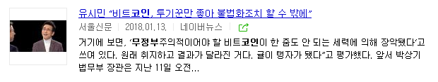 2018년 01월 11일 코인 투자자들의 표현을 빌리면 '박 상기의 난'이 벌어졌고, 뒤 이어 유 시민 등이 불난 곳에 기름을 끼 얻기 시작했습니다. 지금 되돌아보면 참 우스운 일입니다. 말이 좋아 우스운 일이지, 저 몇몇 사람으로 인해 막대한 경제적 피해를 본 사람들은 무슨 죄입니까?