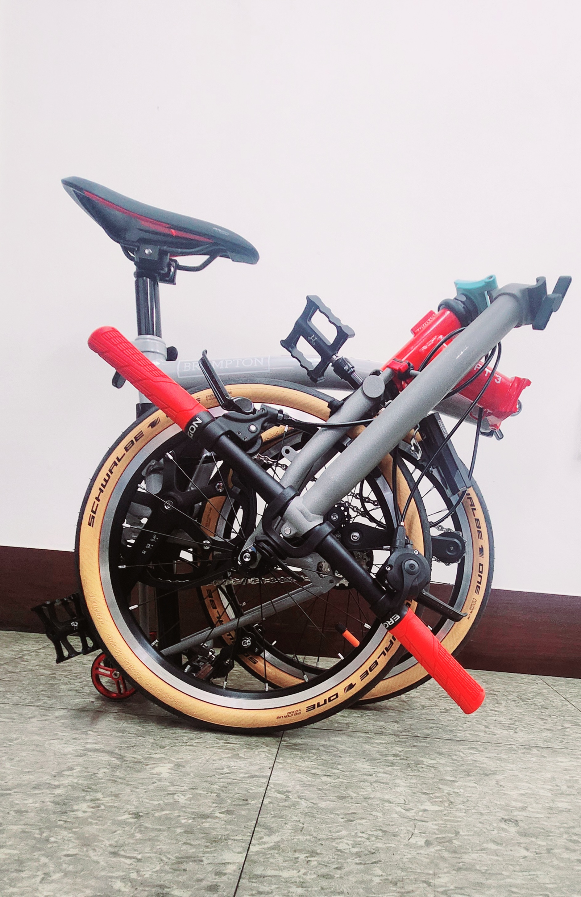 그렇게 교환이 완료된 그립을 끼운 챕터3의 폴딩상태입니다. 챕터 3은 조금 더 스피드 있는 레이싱 타입의 튜닝을 계획하고 있기 때문에 앞으로 많은 변화를 소개할 수 있을 것으로 예상됩니다.
