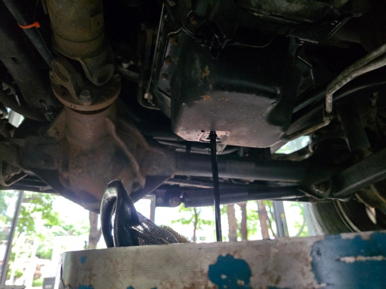 그리고 기존에 있던 엔진오일을 빼내어줍니다. 구 엔진오일의 자유낙하가 끝나면, 드레인 볼트는 잘 수거하여 테프론 테이프로 몇 번 감아주고 다시 조입니다.